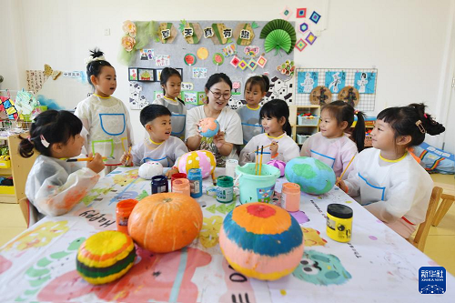 7月17日,在山東省青島市市北區(qū)第二實(shí)驗(yàn)幼兒園開展的“夏天真有趣”繪畫活動(dòng)中,老師指導(dǎo)小朋友彩繪南瓜創(chuàng)意畫。(新華社發(fā) 王海濱 攝)