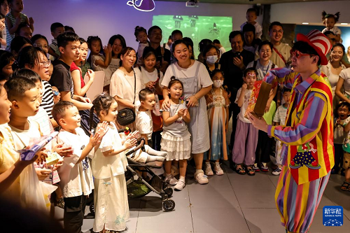 7月17日,在湖北省武漢市銷品茂海洋館,民間藝人為孩子們表演節(jié)目。(新華社發(fā) 趙軍 攝)