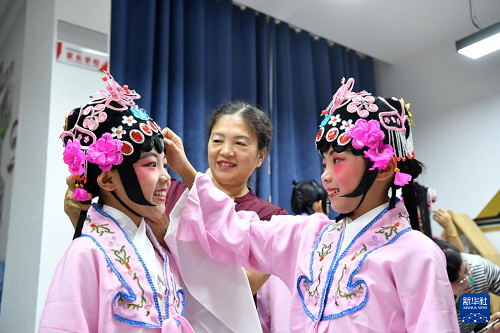 7月17日,在江西省樟樹市大橋街道金橋社區(qū)新時(shí)代文明實(shí)踐站,大橋文工團(tuán)演員在給學(xué)習(xí)采茶戲的孩子整理頭飾。(新華社發(fā) 周亮 攝)