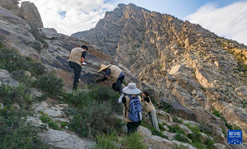 7月23日,工作人員在賀蘭山巖畫遺址區(qū)內(nèi)進(jìn)行2025年度巖畫復(fù)查(無人機(jī)照片)。(新華社記者 楊植森 攝)