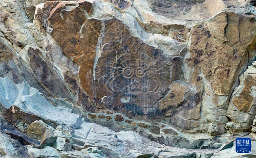 這是7月23日拍攝的賀蘭山巖畫景區(qū)內(nèi)著名的標(biāo)志性巖畫“太陽神”(無人機(jī)照片)。(新華社記者 楊植森 攝)
