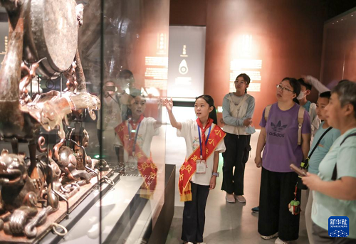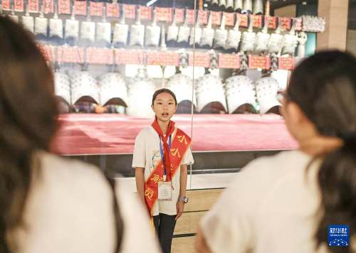 7月27日,在湖北省博物館,小學(xué)生講解員為觀眾介紹展覽。(新華社發(fā) 趙軍 攝)