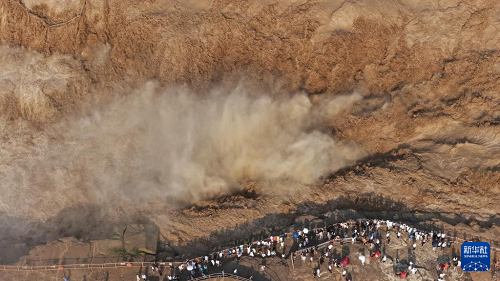 7月27日,人們在山西吉縣觀看黃河壺口瀑布(無人機照片)。(新華社發(fā) 呂桂明 攝)