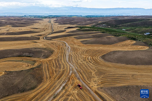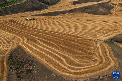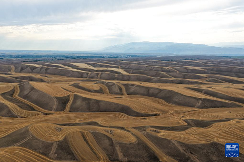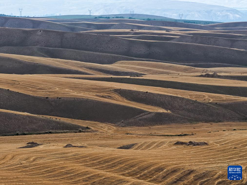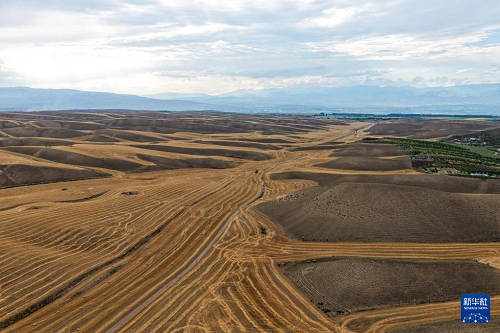 近日,在位于天山北麓的新疆維吾爾自治區(qū)伊犁哈薩克自治州特克斯縣,成熟的小麥迎來收獲。當?shù)剞r(nóng)民搶抓有利天氣,開展夏收工作。