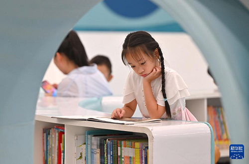8月3日,小朋友在位于??谑械暮D鲜D書館讀書。(新華社記者 郭程 攝)