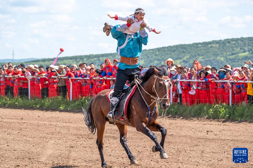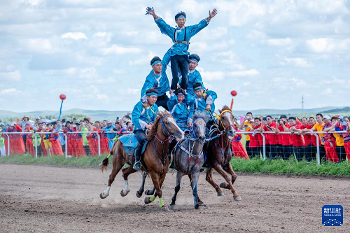 8月7日,演員在農(nóng)牧民那達慕大會上表演馬術(shù)。(新華社記者 馬金瑞 攝)