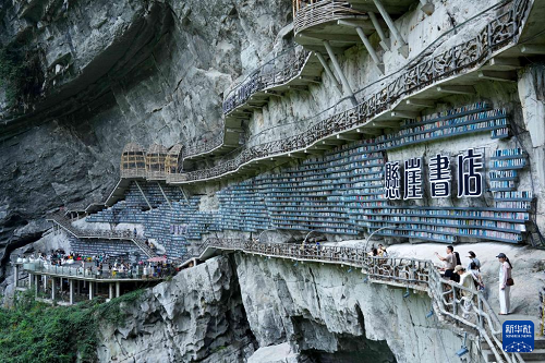 這是8月9日拍攝的廣西河池市羅城仫佬族自治縣棉花天坑景區(qū)內(nèi)的懸崖書店。(新華社發(fā) 龍濤 攝)