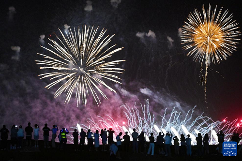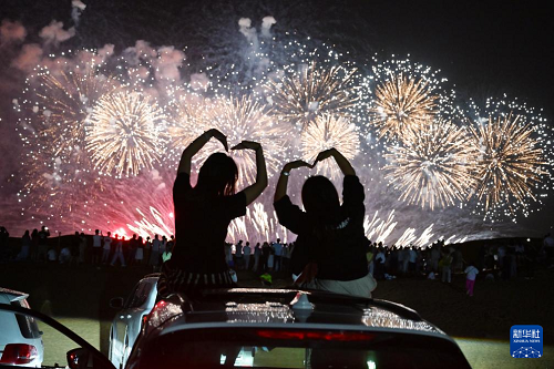 8月10日,游客在寧夏中衛(wèi)市沙坡頭區(qū)觀看煙花表演。(新華社發(fā) 袁宏彥 攝)