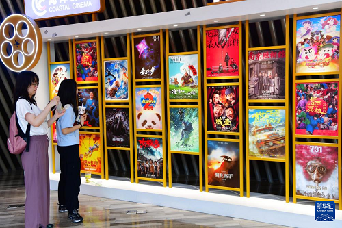 8月17日,觀眾在江蘇省無(wú)錫市一家影城的電影海報(bào)前駐足。(新華社發(fā) 還月亮 攝)