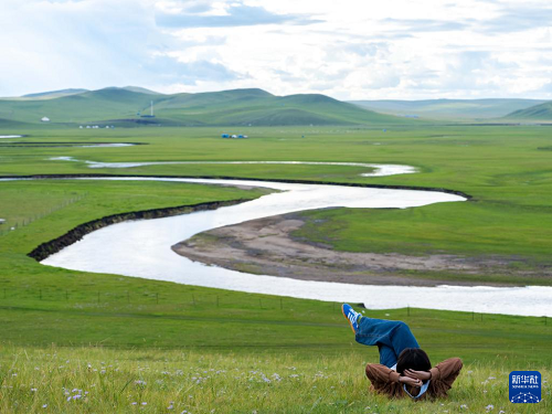 8月19日,在內(nèi)蒙古呼倫貝爾市陳巴爾虎旗,游客躺在莫爾格勒河畔的草地上。(新華社記者 馬金瑞 攝)