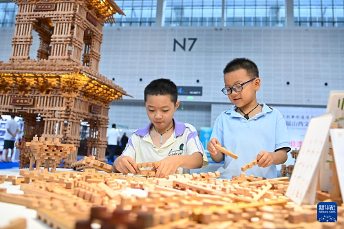 8月21日,兩位小朋友在第七屆山西文化產(chǎn)業(yè)博覽交易會(huì)上體驗(yàn)榫卯積木拼搭。(新華社記者 楊晨光 攝)