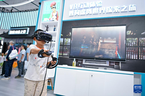 8月21日,一位小朋友在第七屆山西文化產(chǎn)業(yè)博覽交易會(huì)上通過VR設(shè)備游覽晉祠。(新華社記者 楊晨光 攝)