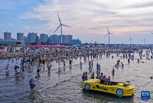 8月23日,游客在位于山東省榮成市的那香海海水浴場體驗(yàn)水上項(xiàng)目(無人機(jī)照片)。(新華社發(fā) 李信君 攝)