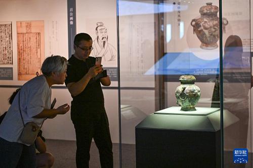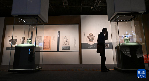 8月28日,觀眾在展覽中觀看文物克罍。(新華社記者 陳鐘昊 攝)