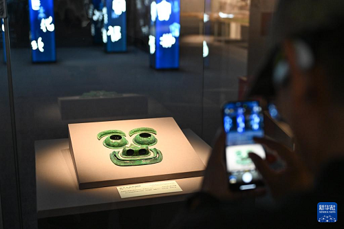 這是8月28日拍攝的展覽中的組合人面形銅飾。(新華社記者 陳鐘昊 攝)