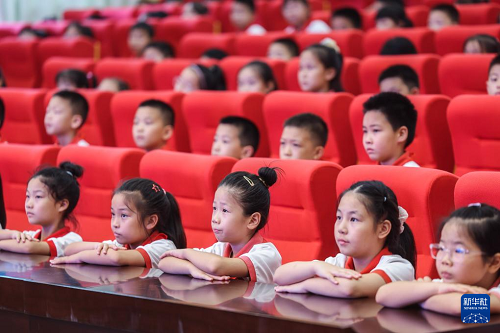9月4日,北京師范大學(xué)南湖附屬學(xué)校的學(xué)生們?cè)趯W(xué)校大講堂參加開(kāi)學(xué)第一課《紅船精神》。(新華社記者 徐昱 攝)