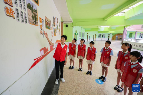 9月4日,北京師范大學(xué)南湖附屬學(xué)校的老師在給學(xué)生們講解“致敬禾城鐵血·同輝國(guó)旗榮光”——嘉興市新四軍老戰(zhàn)士抗戰(zhàn)英勇事跡圖版巡展的英雄事跡。(新華社記者 徐昱 攝)