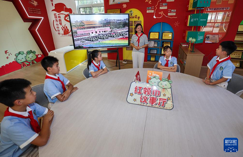 9月4日,浙江省“新時(shí)代好少年”、資深紅船小講解莫景鑠(左一)在嘉興市實(shí)驗(yàn)小學(xué)給新一批紅船小講解員傳授自己的講解經(jīng)歷和經(jīng)驗(yàn),同時(shí)也介紹了學(xué)校紅船小講解的歷史由來(lái)。(新華社記者 徐昱 攝)