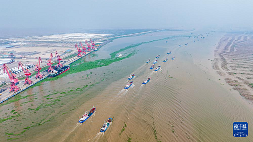 9月16日,在江蘇省鹽城市射陽縣,近千艘漁船起航展開捕撈作業(yè)(無人機(jī)照片)。(新華社發(fā) 彭嶺 攝)