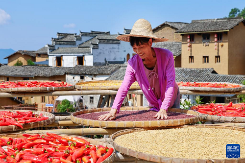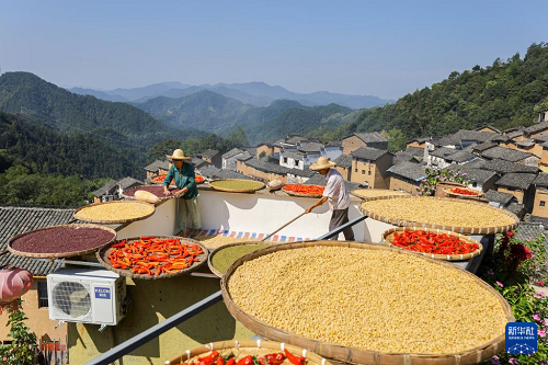 秋收時節(jié),在安徽省黃山市歙縣深渡鎮(zhèn)陽產(chǎn)村,村民利用晴好天氣,抓緊晾曬收獲的辣椒、玉米、山核桃等農(nóng)作物,描繪出一幅山村“曬秋”圖。