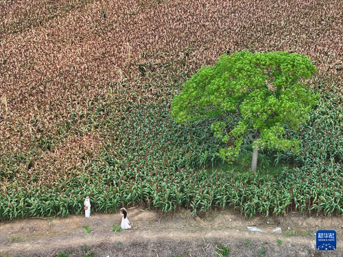 9月21日,游人在高粱地打卡拍照(無人機(jī)照片)。(新華社記者 季春鵬 攝)