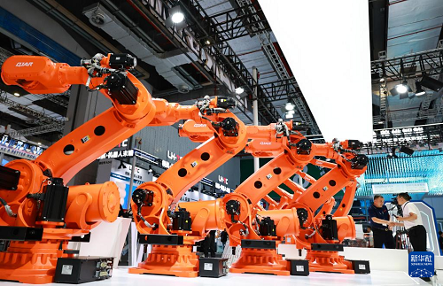 這是展覽現(xiàn)場展示的一組大型工業(yè)機(jī)器人產(chǎn)品(9月23日攝)。(新華社記者 方喆 攝)