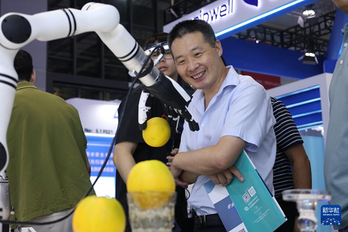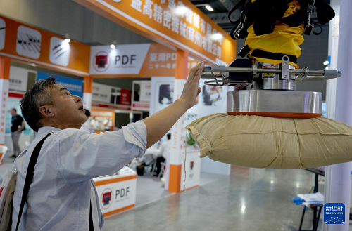 9月23日,參觀者在一個(gè)進(jìn)行抓取動(dòng)作演示的機(jī)器手展品前駐足觀看。(新華社發(fā) 潘宗源 攝)