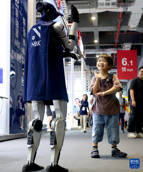 9月23日,小朋友在展會(huì)現(xiàn)場與人形機(jī)器人互動(dòng)。(新華社發(fā) 潘宗源 攝)