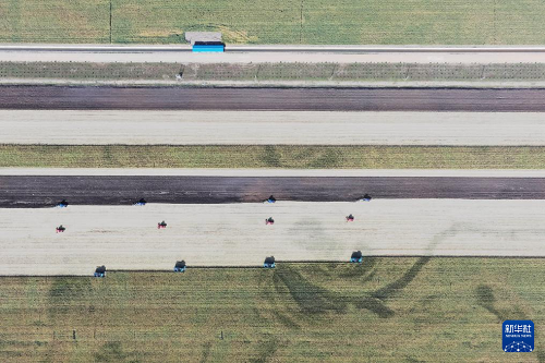 9月23日,在黑龍江北大荒農(nóng)業(yè)股份有限公司友誼分公司一旱田地塊,大型農(nóng)業(yè)機(jī)械在進(jìn)行玉米收獲作業(yè)(無(wú)人機(jī)照片)。(新華社記者 王松 攝)
