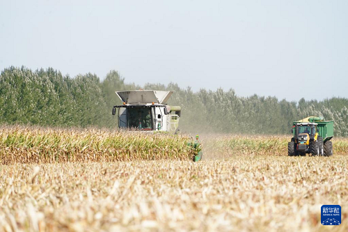 9月23日,在黑龍江北大荒農(nóng)業(yè)股份有限公司友誼分公司一旱田地塊,大型農(nóng)業(yè)機(jī)械在進(jìn)行玉米收獲作業(yè)。(新華社記者 王松 攝)