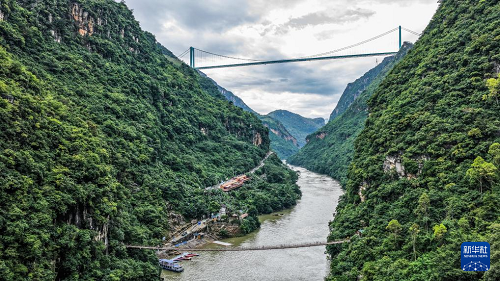 景區(qū)內(nèi)的索道橋與遠(yuǎn)處的花江峽谷大橋遙相呼應(yīng)(9月27日攝,無人機(jī)照片)。(新華社記者 陶亮 攝)