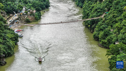 游客乘船游覽花江大峽谷景區(qū)(9月27日攝,無人機(jī)照片)。(新華社記者 陶亮 攝)