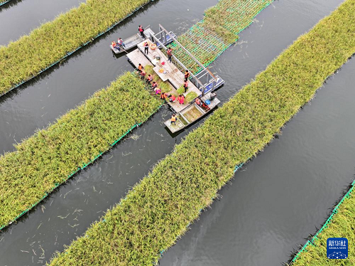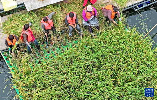 10月14日,工人在淮南市鳳臺縣顧橋鎮(zhèn)采煤沉陷區(qū)水面上收獲漂浮式水稻(無人機(jī)照片)。(新華社發(fā) 陳彬 攝)