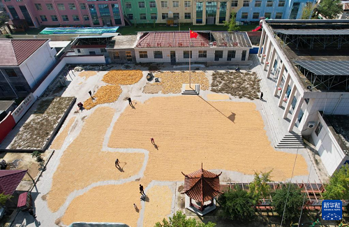 10月14日,農(nóng)戶在山東省臨沂市沂南縣蘇村鎮(zhèn)寶珠村廣場上晾曬糧食(無人機照片)。(新華社發(fā) 尹君 攝)