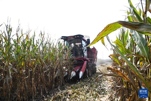 10月14日,河南省濟源市五龍口鎮(zhèn)農(nóng)民駕駛農(nóng)機在田間搶收玉米。(新華社發(fā) 苗秋鬧 攝)