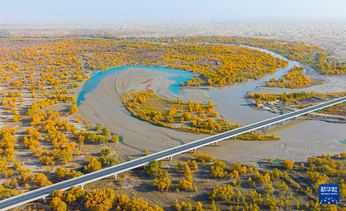 金秋時(shí)節(jié),新疆巴音郭楞蒙古自治州尉犁縣境內(nèi)的沙漠胡楊景觀與塔里木河互相映襯,美不勝收,吸引不少游客觀光游覽。