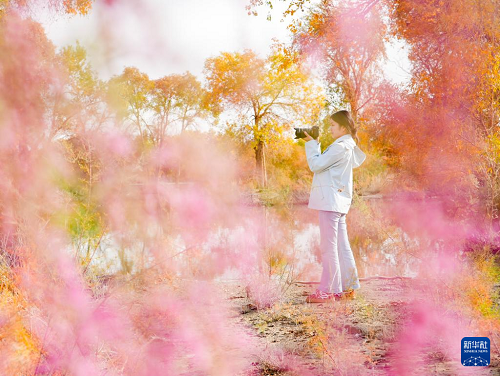 10月13日,游客在新疆巴音郭楞蒙古自治州尉犁縣一處胡楊林中拍照打卡。(新華社發(fā) 汪志鵬 攝)