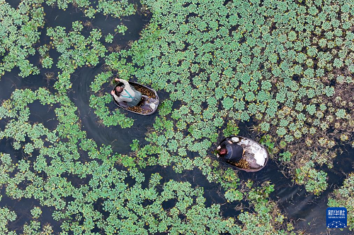 10月22日,浙江省湖州市吳興區(qū)東林鎮(zhèn)泉心村村民劃著菱桶采摘菱角(無人機照片)。(新華社發(fā) 何偉衛(wèi) 攝)