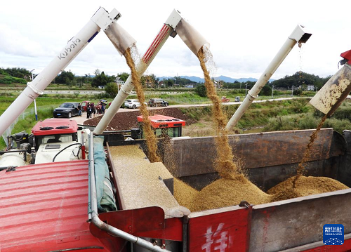 10月22日,在四川省達(dá)州市大竹縣石橋鋪鎮(zhèn)長青村的稻田間,農(nóng)機手將收獲的水稻裝入運糧車。(新華社發(fā) 鄧良奎 攝)