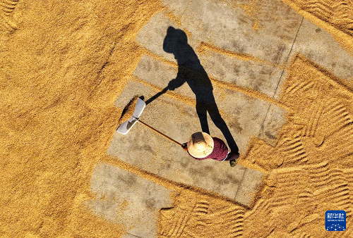 10月22日,農(nóng)民在江蘇里下河地區(qū)農(nóng)科所(揚州市農(nóng)科院)晾曬稻谷(無人機照片)。(新華社發(fā) 孟德龍 攝)