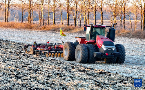 10月23日,農(nóng)機(jī)在北大荒集團(tuán)北安分公司龍鎮(zhèn)農(nóng)場(chǎng)有限公司第一管理區(qū)進(jìn)行整地作業(yè)(無(wú)人機(jī)照片)。(新華社發(fā) 錢泊羽 攝)
