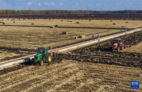 10月23日,農(nóng)機(jī)在黑龍江北大荒農(nóng)業(yè)股份友誼分公司田間進(jìn)行整地作業(yè) (無(wú)人機(jī)照片)。(新華社發(fā) 徐宏宇 攝)