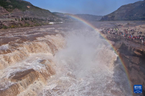 10月27日,位于山西吉縣和陜西宜川縣交界的黃河壺口瀑布景區(qū)天氣晴好,飛濺的水霧在陽(yáng)光照射下,形成一道壯美的“彩虹橋”。