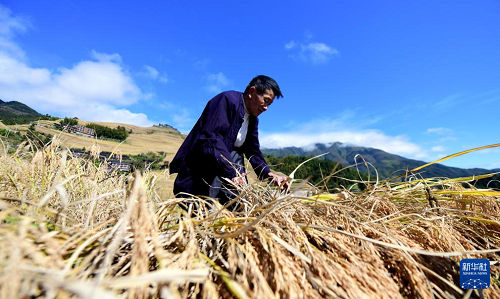 11月5日,龍脊鎮(zhèn)大寨村村民在梯田上收割水稻。(新華社發(fā) 潘志祥 攝)