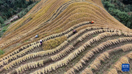 日前,廣西桂林市龍勝各族自治縣龍脊鎮(zhèn)大寨村種植的水稻進(jìn)入收獲季節(jié),梯田之上呈現(xiàn)出一派忙碌的景象。