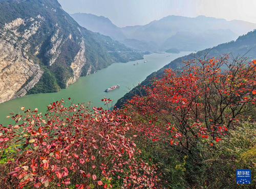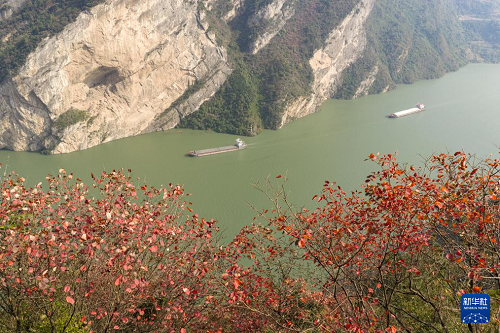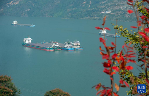 11月16日,船舶行駛在湖北省宜昌市秭歸縣西陵峽水域(無人機照片)。(新華社發(fā) 雷勇 攝)