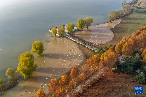 11月16日,天鵝棲息在山西省運城市平陸縣黃河濕地三灣段。(新華社發(fā) 權永軍 攝)