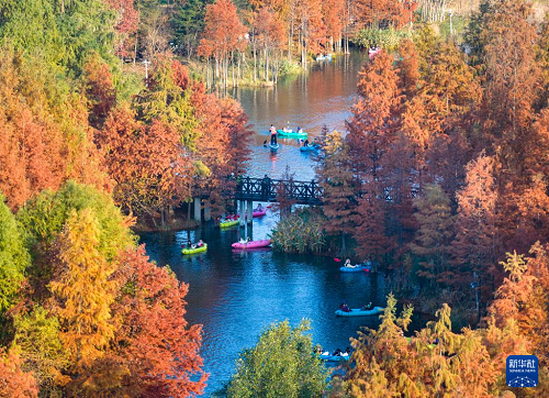 12月14日,人們?cè)谡憬幉ㄖ参飯@水杉林中揮槳戲水,樂享冬日暖陽(yáng)(無(wú)人機(jī)照片)。(新華社發(fā) 胡學(xué)軍 攝)