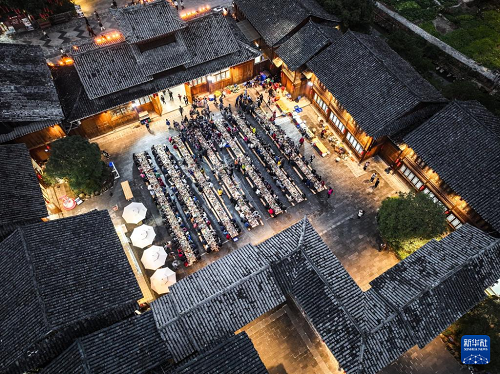 在貴州省黎平縣肇興侗寨,侗族同胞與來賓在侗年活動(dòng)中共享長(zhǎng)桌宴(12月20日攝,無人機(jī)照片)。(新華社記者 楊文斌 攝)