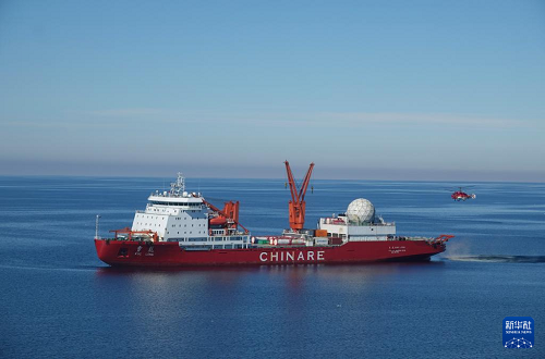 12月29日在秦嶺站海域拍攝的“雪龍”號(hào)極地科考破冰船。(新華社記者 顧天成 攝)